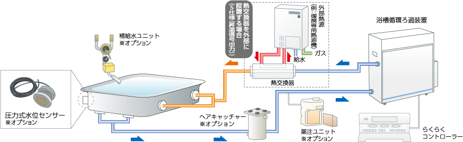 浴槽の高濃度塩素殺菌などの塩素管理に対応して全機種標準でステンレスポンプ、ステンレスヒーター(電気ヒーター仕様)を採用。