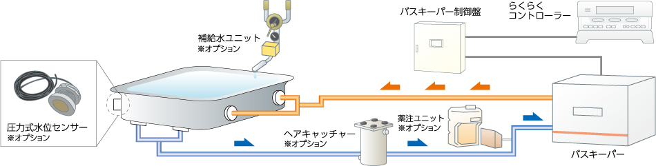 ※オプションバスキーパー(制御盤)と自社開発ソフトをインストールした管理用パソコンをネットワークにつなげることで、パソコンで監視・操作が可能になります(オプション)。