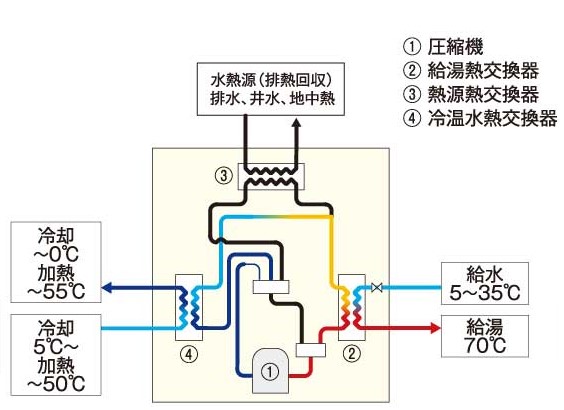 水から水への熱移動でエネルギーをリサイクルする水熱源式ecoシステム。
